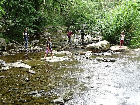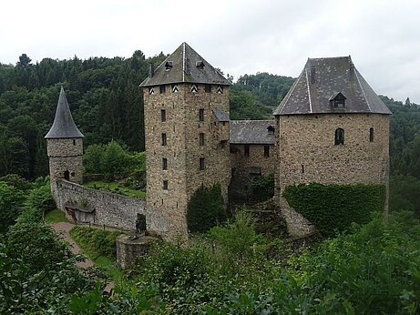 sowie einer Burg, einem Wasserfall, einem Steinbruch, Flüssen und Wald in der näheren Umgebung.
